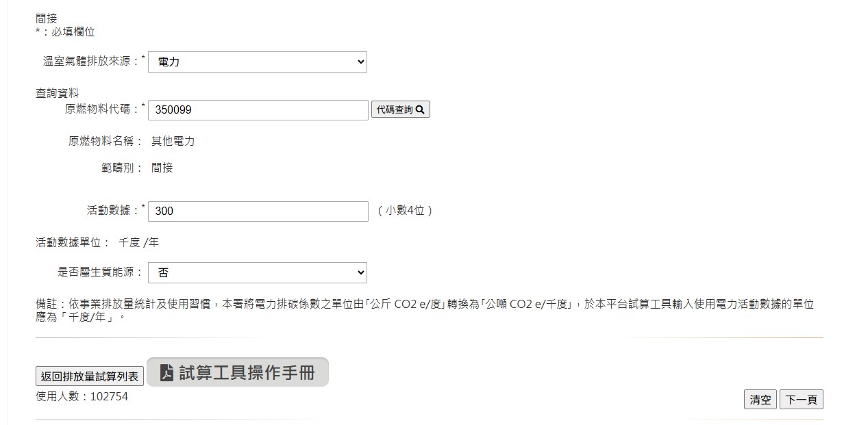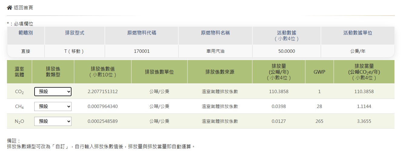 系統會自動帶入預設排放係數,一般直接使用即可。如有特殊需求,也可自行修改年度或標準版本。